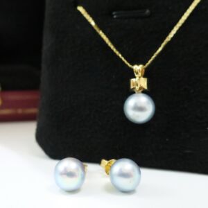 天然 銀色珍珠耳環/耳釘 項鍊套組 黃K金 高貴典雅