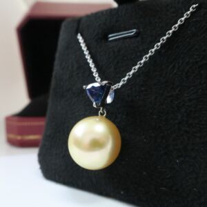 天然 南洋金色珍珠項鍊/吊墬 鑲藍寶石1.26克拉 高貴典雅