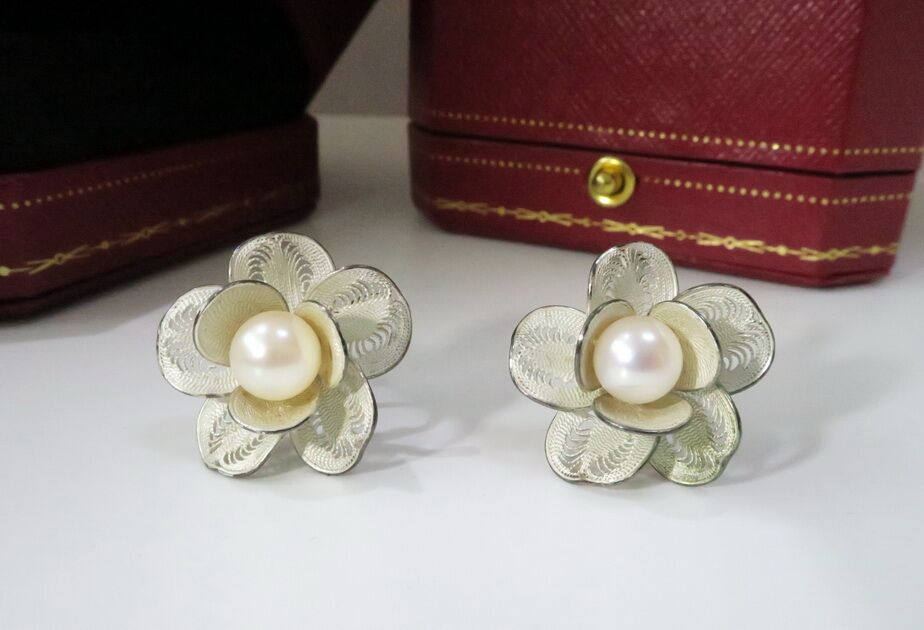天然珍珠耳環/耳夾 山茶花造型 純手工打造 高貴典雅