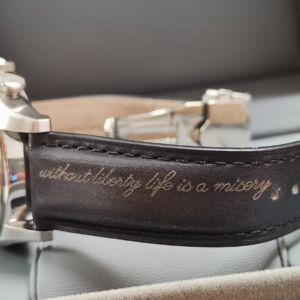 透明底蓋設計 原廠咖啡色皮錶帶(刻有紀念字樣) 原廠摺疊扣