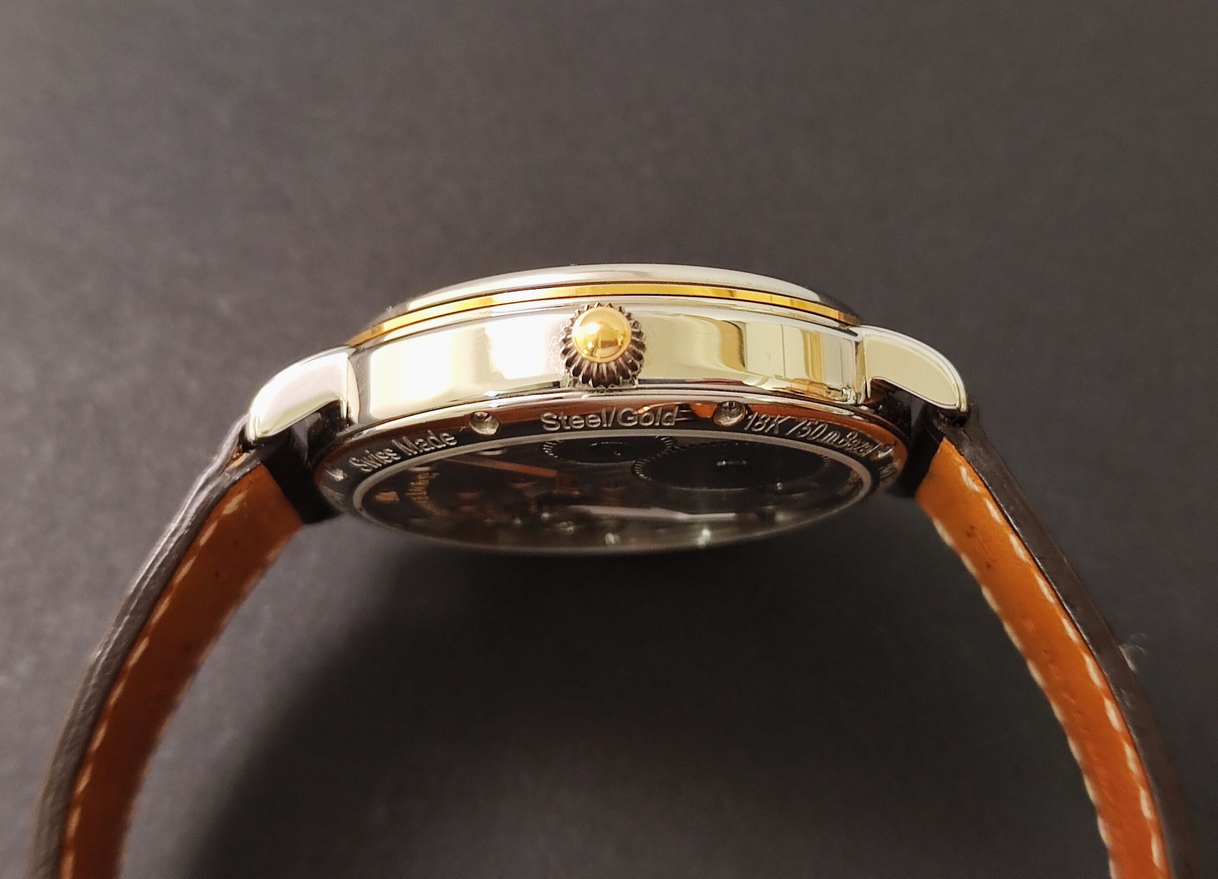 透明底蓋設計 代用咖啡色鱷魚皮錶帶 原廠K金錶扣
