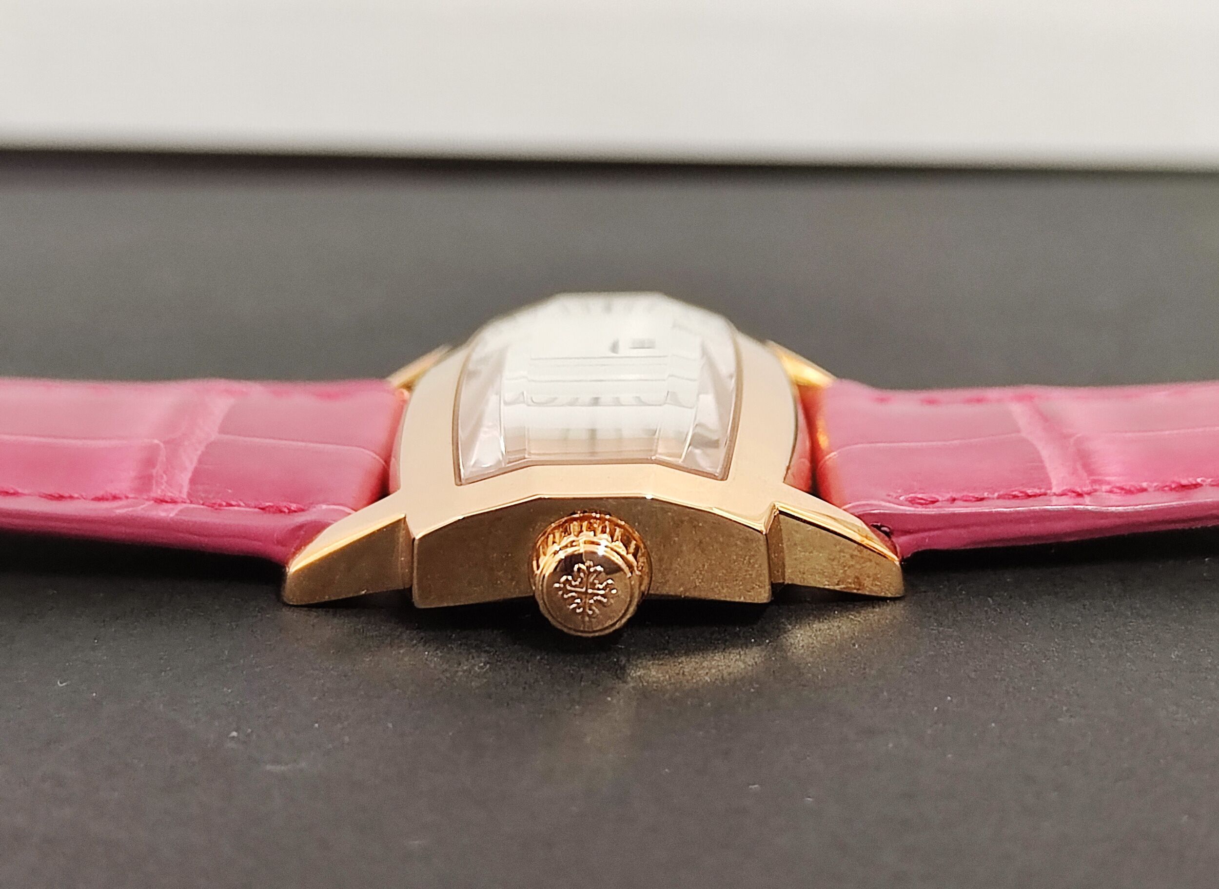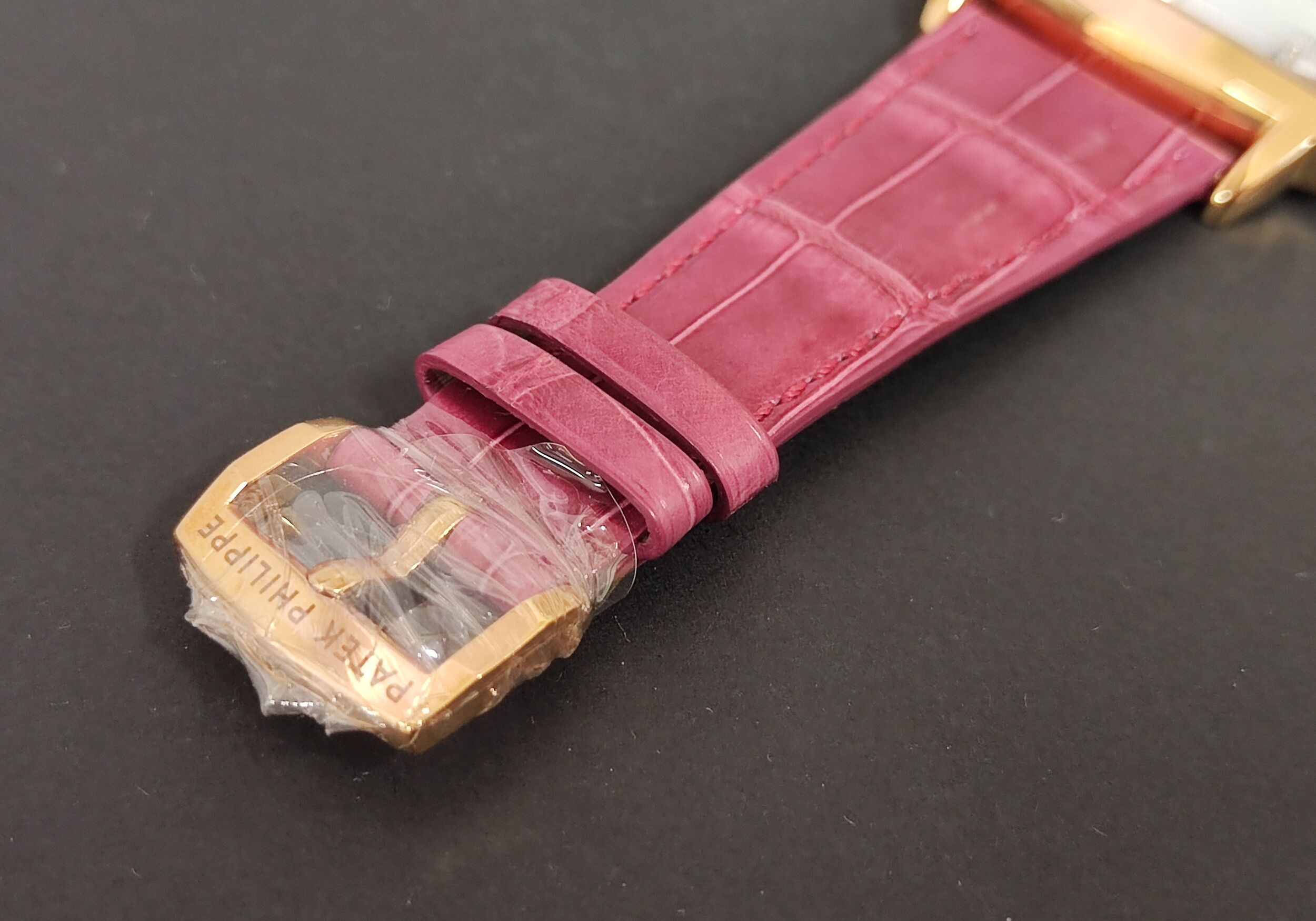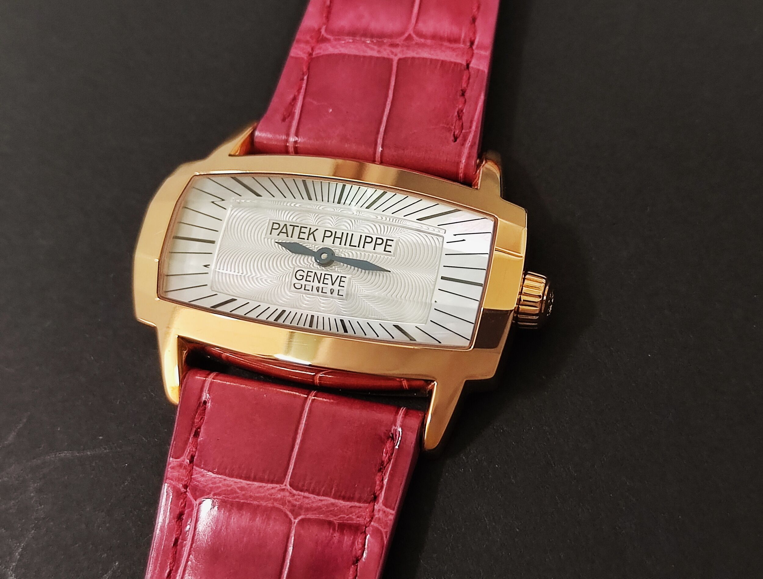 PP 百達翡麗 4980R 玫瑰金 白色珍珠母貝 雕花面盤 石英機芯 長方形錶殼~原廠盒單 未使用品