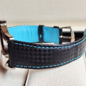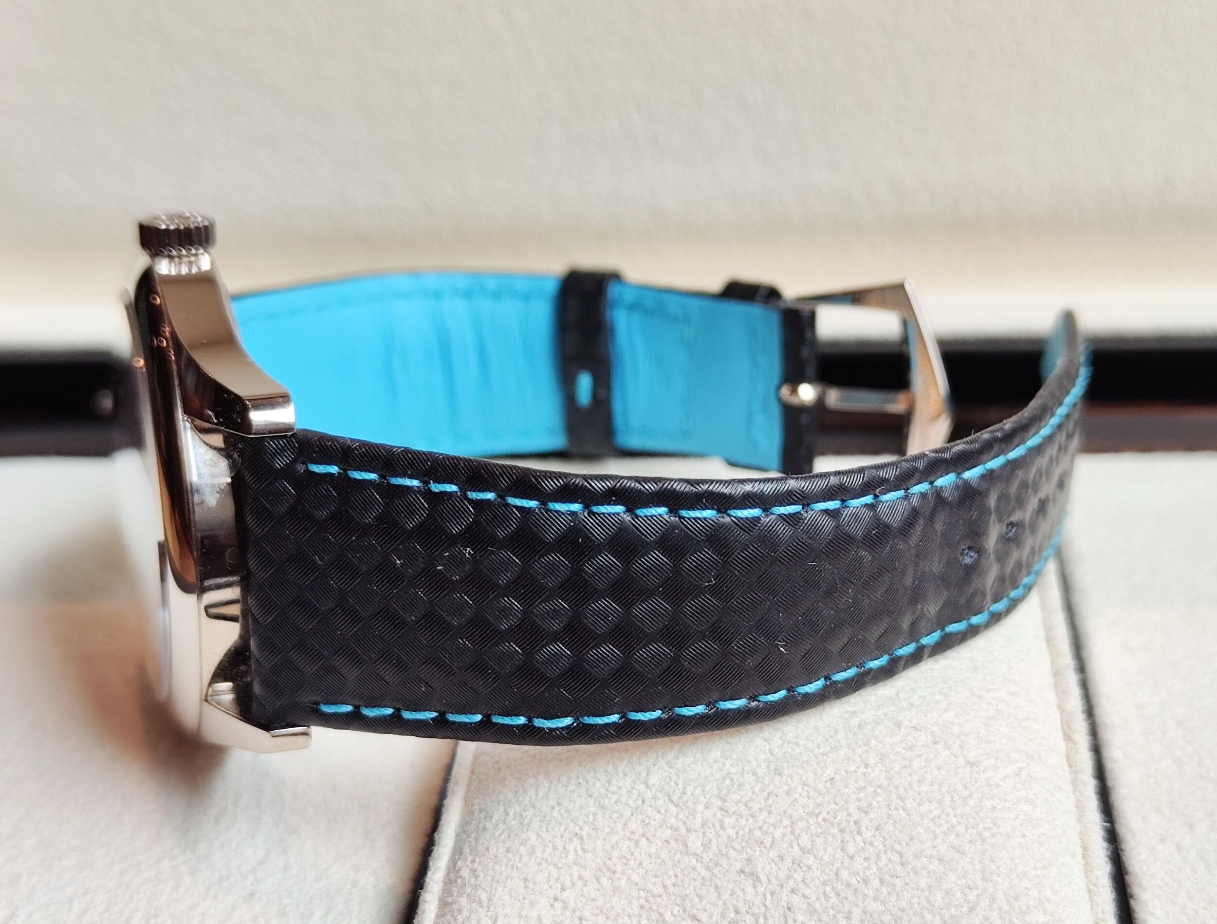 透明底蓋設計 原廠碳纖維圖案皮錶帶+藍色車縫線 原廠白金錶扣