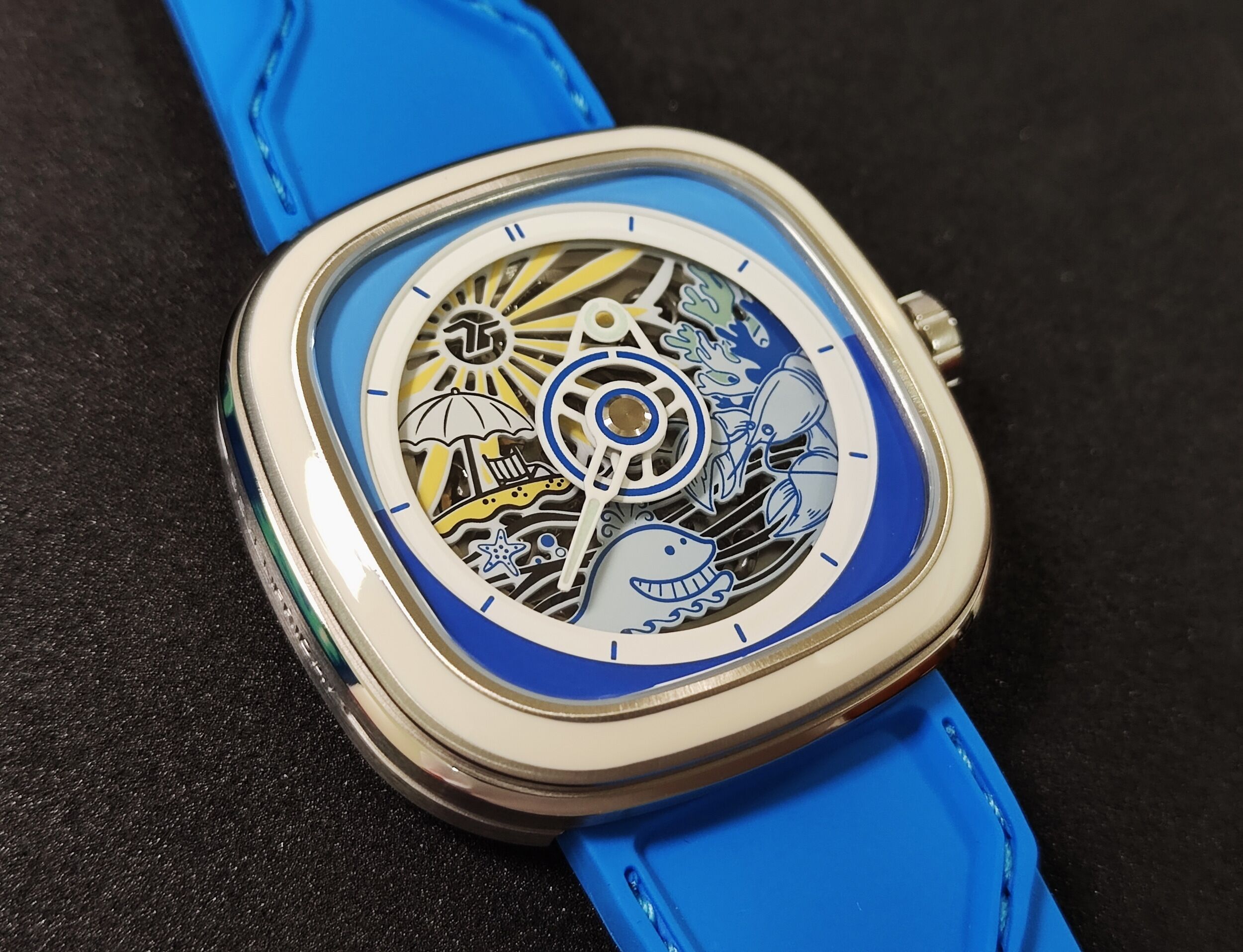 自動上鍊機芯 半鏤空 藍色海洋沙灘面盤 時間顯示